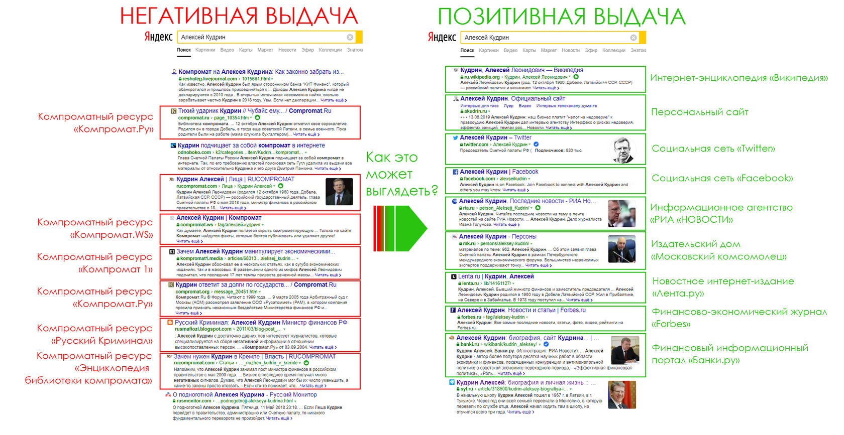 • В результате работы по нужным запросам Яндекс начинает выдавать только заранее отобранные позитивные материалы. Благодаря этому, создается необходимый позитивный образ компании или персоны.